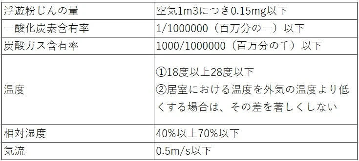 【 建築物に設ける中央管理方式の空気調和設備の構造は、他の規定以外、居室の次表の事項が基準に適合するよう空気を浄化し、温度・湿度・流量を調節して供給・排出できる性能を持ち、安全上・防火上・衛生上支障ない構造方法を用います。 】